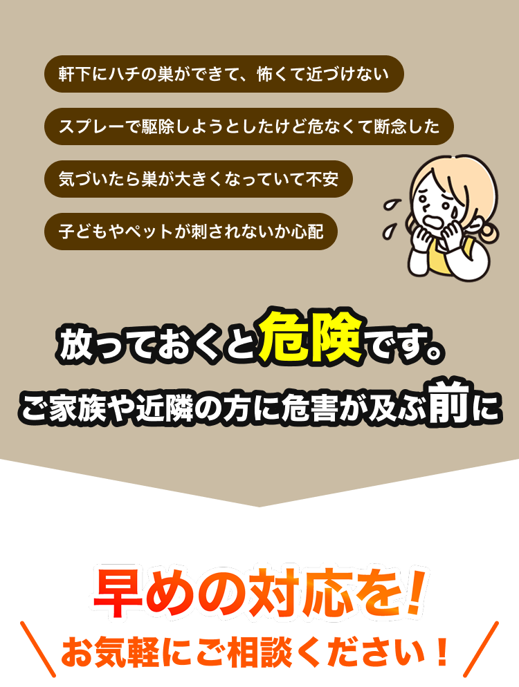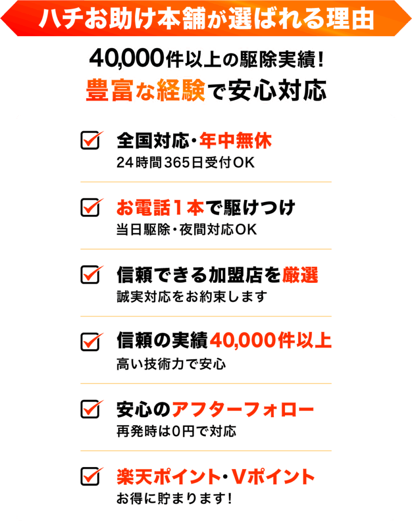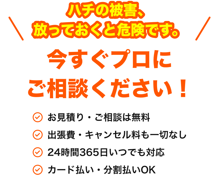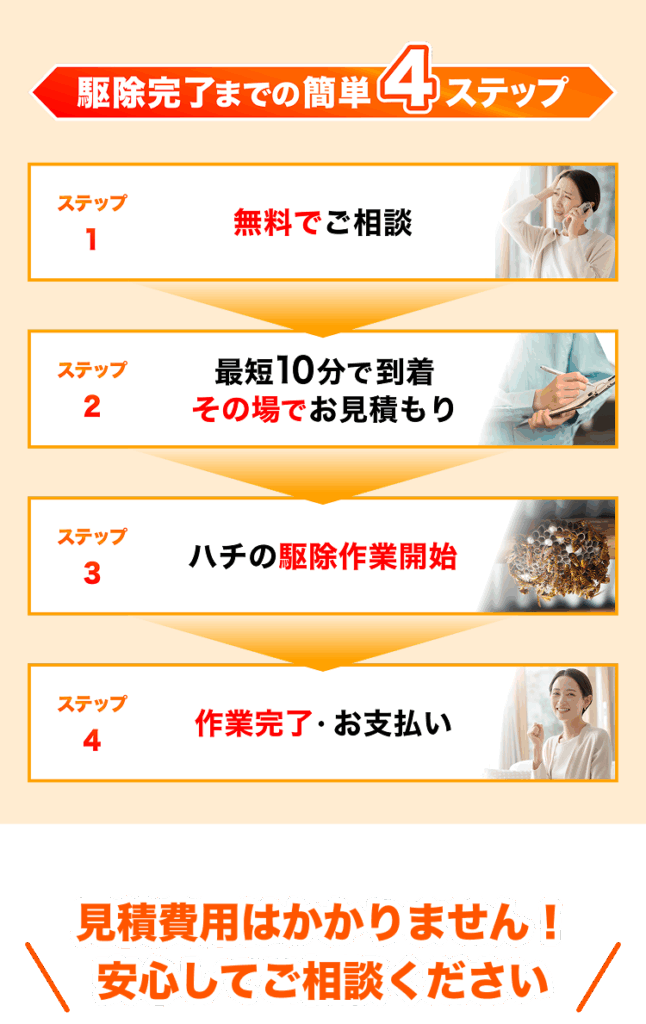 お近くの作業員がすぐにお伺いいたします。現場の調査後、すぐに駆除ができますのでご安心ください。受付にて到着時間のご案内をさせていただきます。