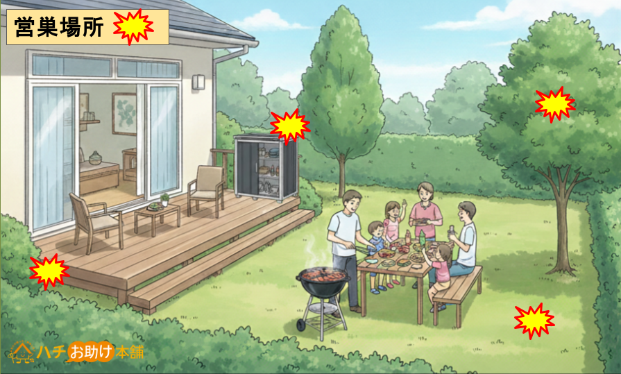 スズメバチの巣が敷地内にあるとわかった場合は、バーベキュー当日の煙や音の刺激が伝わりやすいため、事前に駆除しておきましょう。スズメバチが営巣しやすい場所は、「自宅バーベキューでは要注意なスズメバチの営巣場所」で解説します。