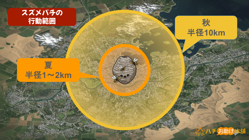 スズメバチは巣を中心に行動します。多くのスズメバチの行動範囲は、夏は半径1~2km、秋は半径10kmが目安です。近隣に巣が見当たらない場合でも、遠くから飛来している可能性が考えられます。