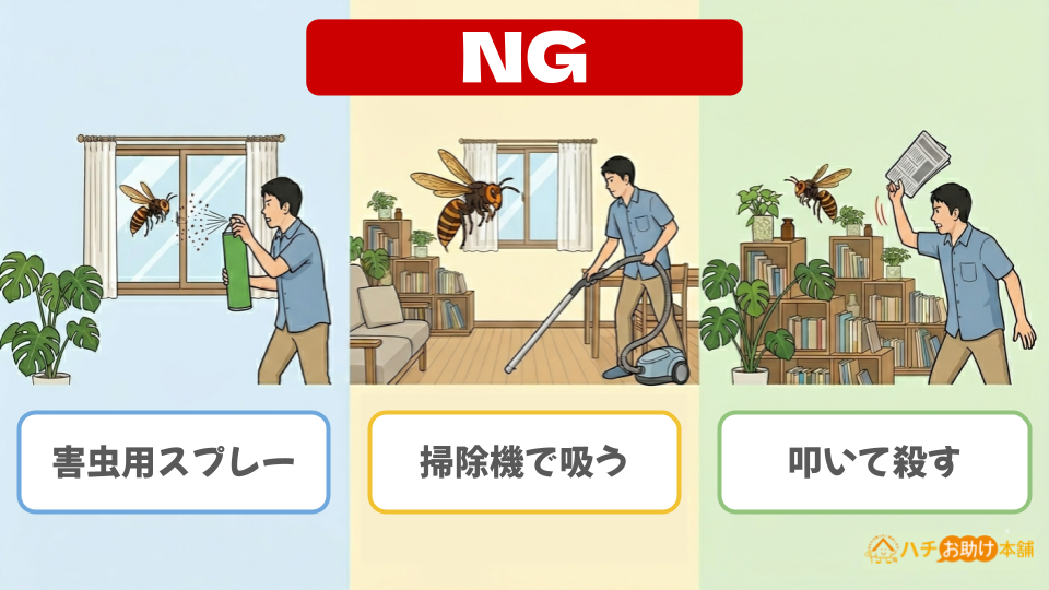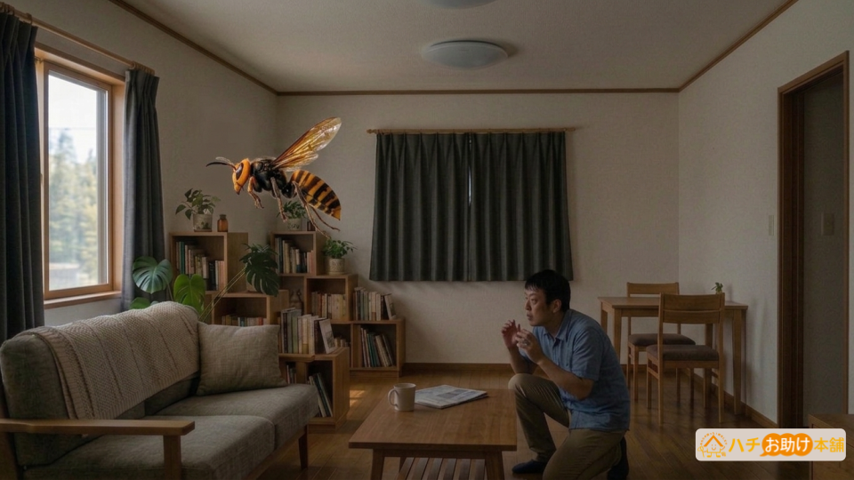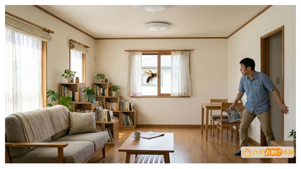 スズメバチが部屋に入ってきた瞬間は、即座に追い出そうとしてはいけません。とるべき行動を3つのステップに分けて解説します。
