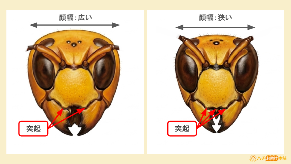 頭楯は複眼(大きな目)の間から顎にかけて備わっている、パネルのような部位のことです。頭楯先端の突起が2つあるのがオオスズメバチ、突起が3つまたは目立たないものはコガタスズメバチと判断できます。