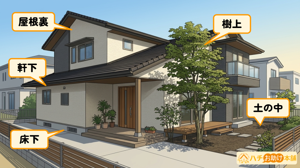 スズメバチが巣を作る(営巣)場所の代表例は次のとおりです。