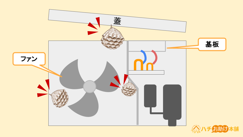 取り外しが比較的容易な蓋の裏に営巣された場合は自分でも撤去できる可能性がありますが、ファンの奥などの手が届きにくい場所に営巣された場合は、外装の取り外しなどの作業が必要です。