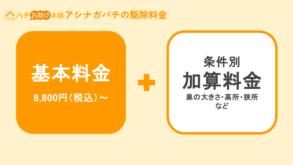 アシナガバチ駆除の基本料金は8,800円(税込)~です。この基本料金に、巣の場所や大きさなどの条件別の加算料金がかかる場合があります。加算条件の例は次のとおりです。