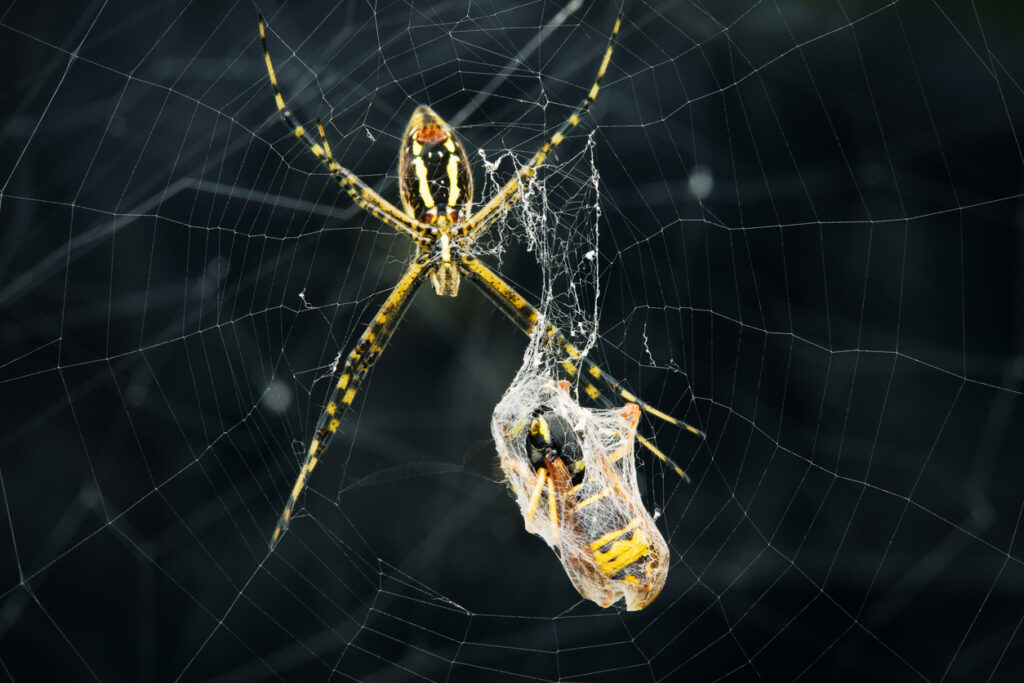 ジョロウグモやコガネグモなど、大型かつ巣を張るタイプの蜘蛛もスズメバチの天敵といえます。飛行中に誤って蜘蛛の巣にひっかかると、スズメバチの運動能力をもってしても、逃げ出すことは困難です。さらに蜘蛛が吐き出す糸によってミイラのようにくるまれると、徐々に弱っていくしかありません。その後は体液を吸われます。