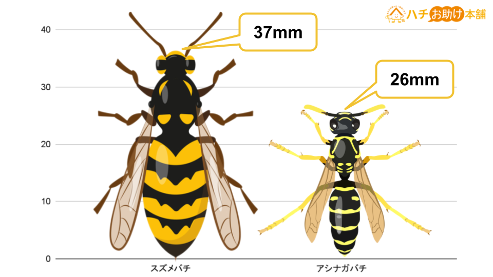 一方のアシナガバチは日本に11種類が生息していますが、14~20mm以下が中心です。大きい種類でも最大の体長が26mmで、オオスズメバチと比較すると1cm以上小さいサイズといえます。