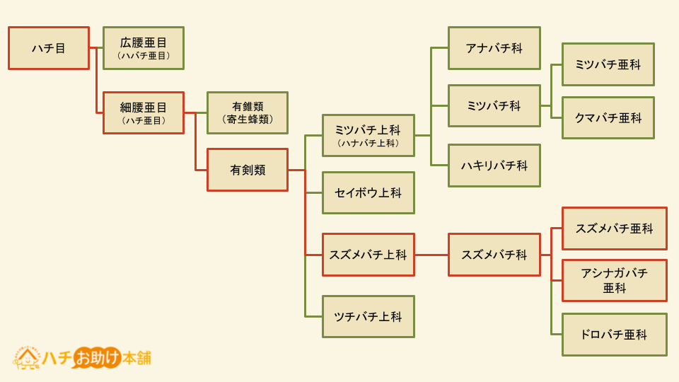 国内最大の蜂はスズメバチ亜科スズメバチ属のオオスズメバチです。その他のを含めてスズメバチは17種類が日本で確認されていますが、スズメバチ属に分類される8種類は20mmを超え、30mm近いものも見られます。ただし、スズメバチ属以外のスズメバチには小さいものもいます。