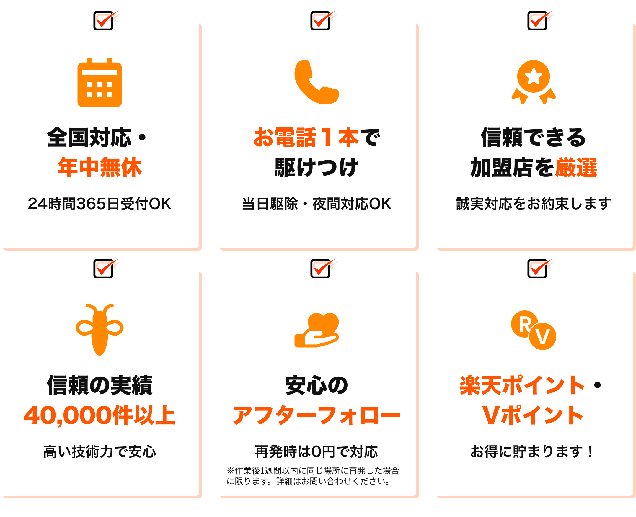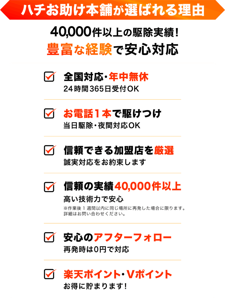 お近くの作業員がすぐにお伺いいたします。現場の調査後、すぐに駆除ができますのでご安心ください。受付にて到着時間のご案内をさせていただきます。
